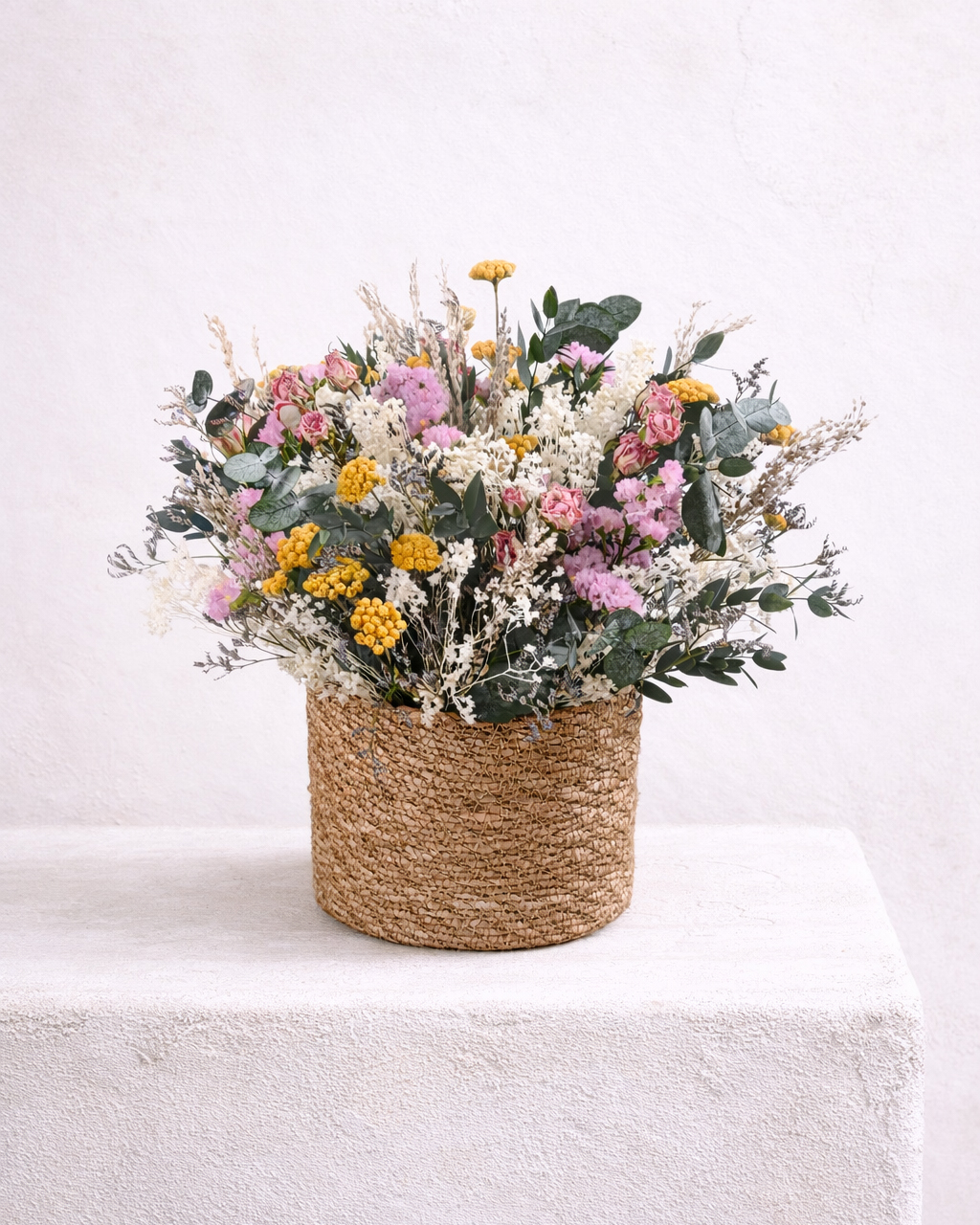 CESTO FLORAL PRESERVADO 06 75,00 € Desconto de %. IVA incluído. Partilhar Comprar Contactar 1 unidades em stock | SKU: CESTO FLORAL PRESERVADO 06 Cesto Floral Preservado. Dimensões: A: 35cm X D: 35cm Composição: - Flores e folhagens 100% preservadas. - Seleção de alta durabilidade. - Base em cesto natural. - Montagem manual Terracotta. Caraterísticas: - Mantém a cor e forma durante muitos meses. - Não necessita de água. - Ideal para presente ou dar um toque acolhedor ao ambiente. - Peça única, feita artesanalmente. Tags cesto floralcesto flores preservadasflores secasflores preservadas Características