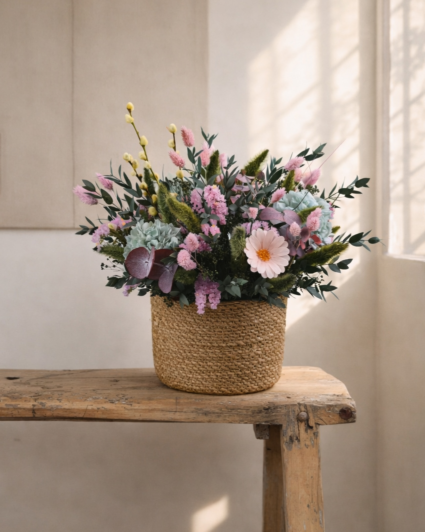 CESTO FLORAL PRESERVADO 11 75,00 € Desconto de %. IVA incluído. Partilhar Comprar Contactar 1 unidades em stock | SKU: CESTO FLORAL PRESERVADO 11 Cesto Floral Preservado. Dimensões: A: 35cm X D: 35cm Composição: - Flores e folhagens 100% preservadas. - Seleção de alta durabilidade. - Base em cesto natural. - Montagem manual Terracotta. Caraterísticas: - Mantém a cor e forma durante muitos meses. - Não necessita de água. - Ideal para presente ou dar um toque acolhedor ao ambiente. - Peça única, feita artesanalmente. Tags cesto floralcesto flores preservadasflores secasflores preservadas Características