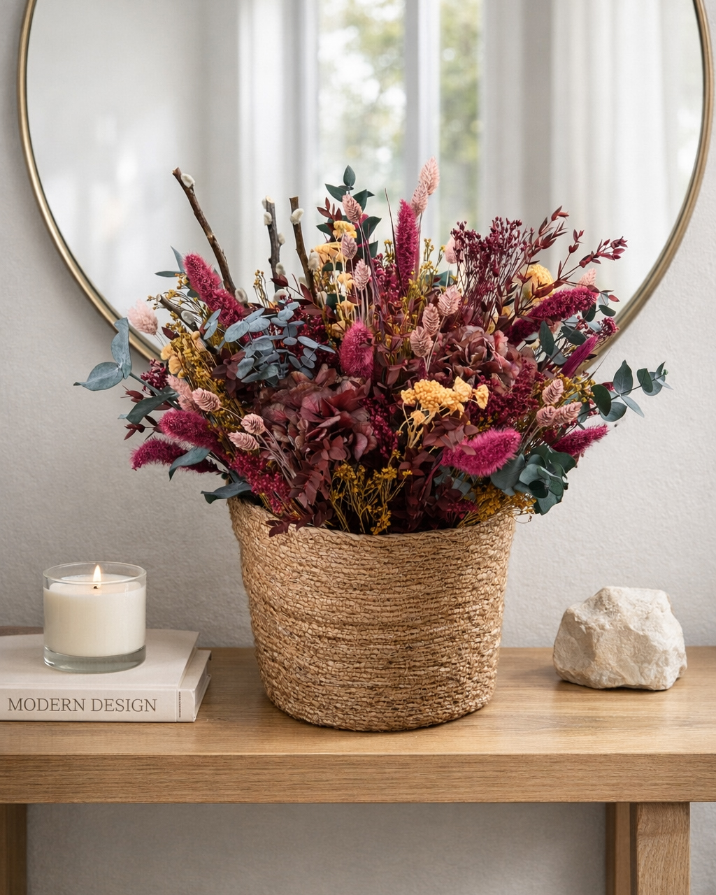 CESTO FLORAL PRESERVADO REF.005 95,00 € Desconto de %. IVA incluído. Partilhar Comprar Contactar 1 unidades em stock | SKU: CESTO FLORAL PRESERVADO REF.005 Cesto Floral Preservado. Dimensões: A: 50cm X D: 45cm Composição: - Flores e folhagens 100% preservadas. - Seleção de alta durabilidade. - Base em cesto natural. - Montagem manual Terracotta. Caraterísticas: - Mantém a cor e forma durante muitos meses. - Não necessita de água. - Ideal para presente ou dar um toque acolhedor ao ambiente. - Peça única, feita artesanalmente. Tags cesto floralcesto flores preservadasflores secasflores preservadas Características